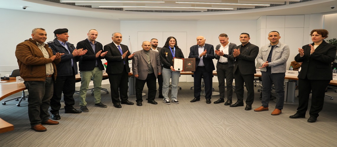 القدس – إعلام اللجنة الأولمبية: منح الفريق جبريل الرجوب، رئيس اللجنة الأولمبية الفلسطينية، نيابة عن سيادة الرئيس محمود عباس، البطلة مريم بشارات، المتوجة بذهبية بطولة العالم للكاراتيه، ميدالية الإنجاز، وذلك على هامش اجتماع المكتب التنفيذي، الذي عقد اليوم السبت في مقر شركة "جوال" بمحافظة رام الله والبيرة.