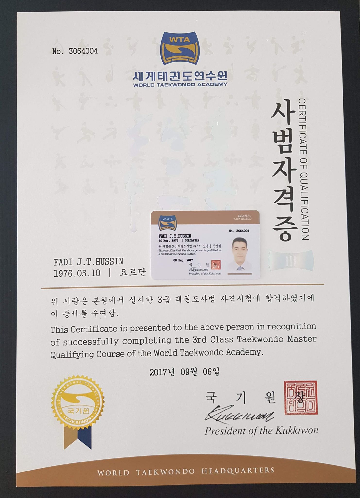 حصل فادي جاسر عضو اتحاد التايكواندو في الشتات، على شهادة الماستر الدولي في اللعبة، بعد مشاركته في عدد من الدورات التدريبية ذات المستوى العالي التي ينظمها الاتحاد الدولي للتايكواندو.