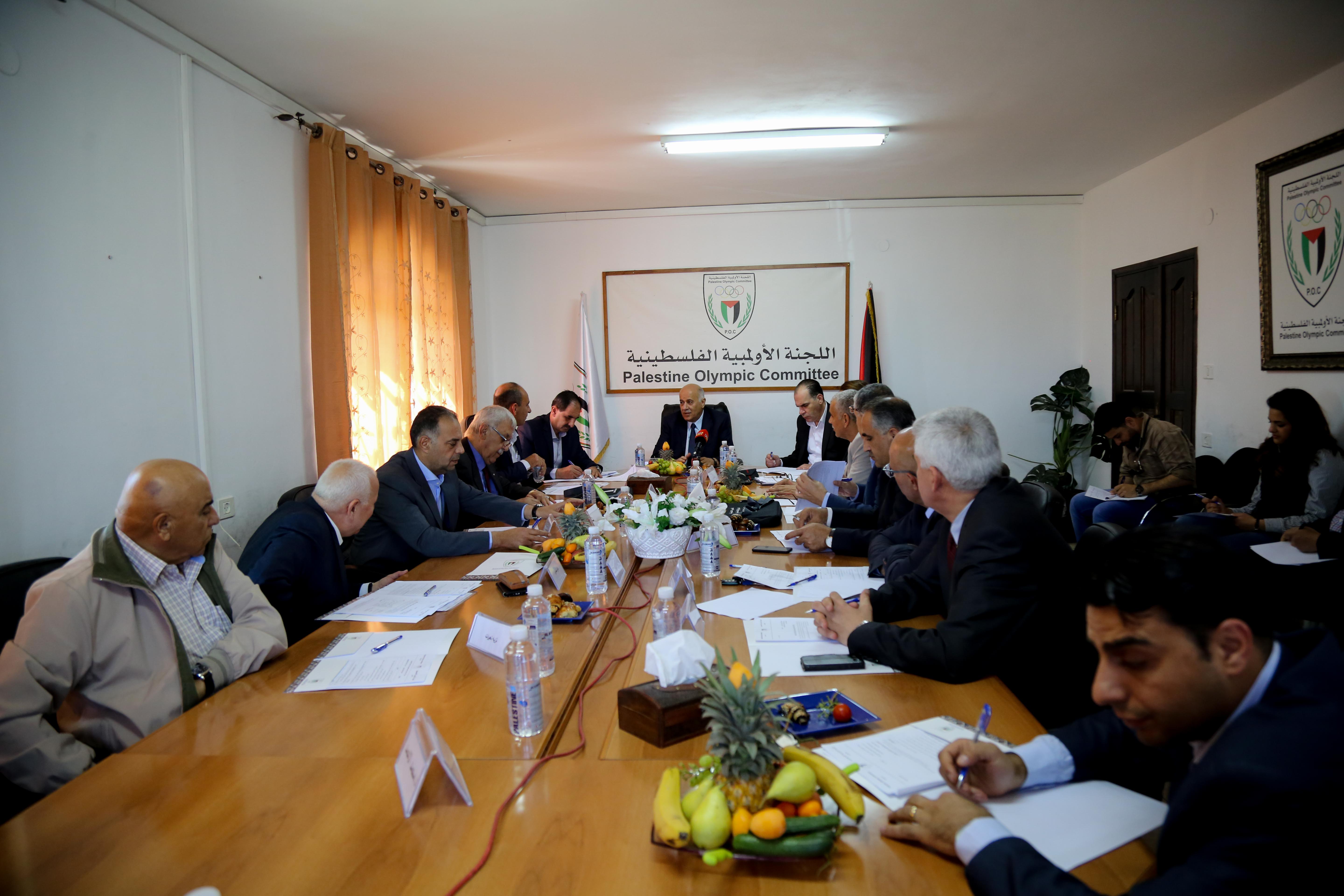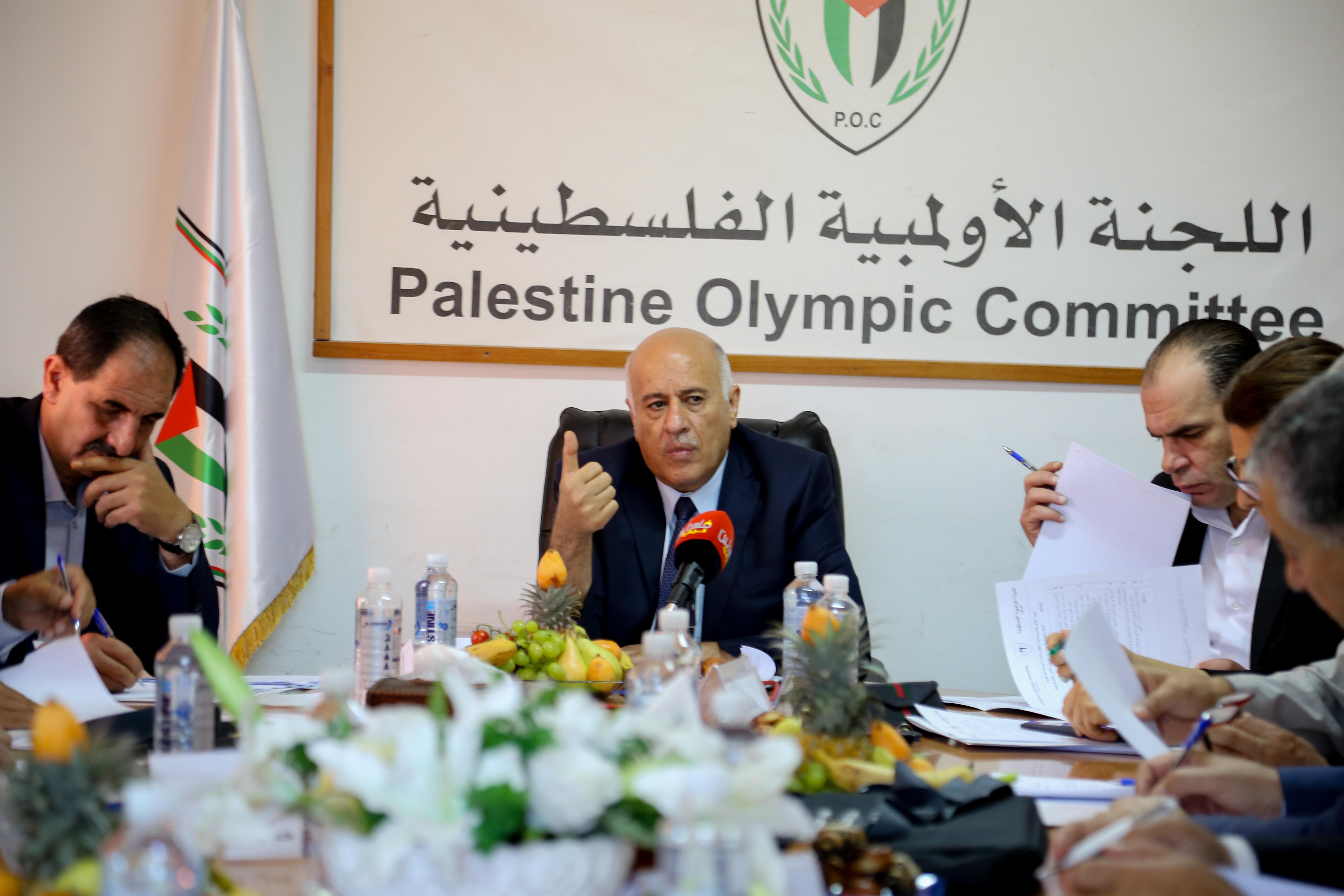 وتوجه اللواء الرجوب في مستهل حديثه بالتحية لشعبنا الفلسطيني الصامد والاسرة الرياضية والقيادة الفلسطينية وعلى رأسها فخامة الرئيس ابو مازن الذي يمثل ضمانة لدعم واسناد الرياضة الوطنية ورسالتها السامية، وأكّد اللواء الرجوب على أنّ أمام الرياضة الفلسطينية تحديات عدة، ومنها المشاركة في بطولتين كبيرتين بحجم الألعاب الأولمبية الآسيوية في أندونيسيا العام الجاري، والألعاب الأولمبية الدولية في طوكيو 2020، وأهمية الظهور بصورة تليق باسم فلسطين وكبرياء شعبها، وضرورة الوقوف عند احتياجاتهما إدارياً وفنّياً ومن مختلف الجوانب الأخرى.