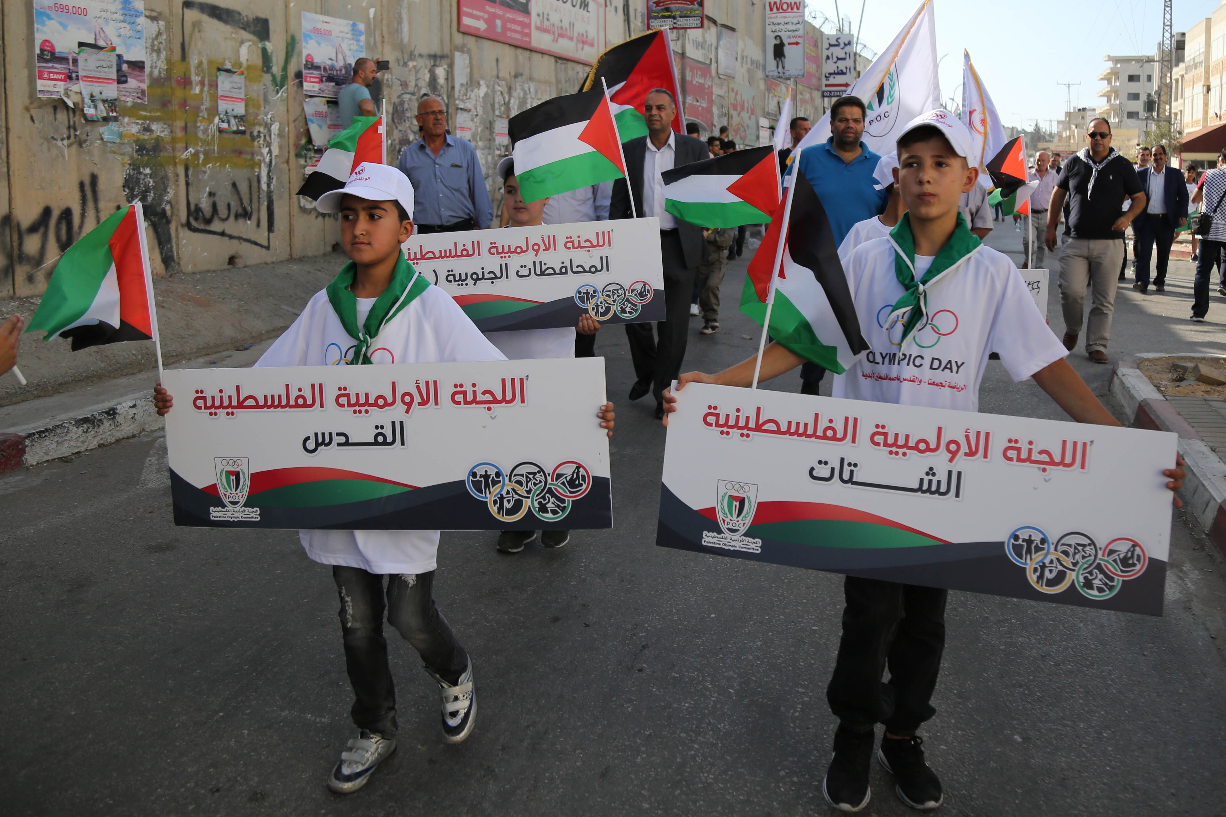 وفي كلمة له أمام جدار الفصل العنصري بمحاذاة ملعب فيصل الحسيني، قال اللواء جبريل الرجوب: "نحن اليوم نحيي، الذكرى 124 عاماً لتأسيس اللجنة الأولمبية الدولية، على أرض فلسطين، وخلف هذا الجدار العنصري، لنقول للعالم أجمع أن الرياضة والرياضيين الفلسطينيين يتعرضون لمضايقات وحصار ومحاولة لكسر إرادتهم من هذا الاحتلال الإسرائيلي".