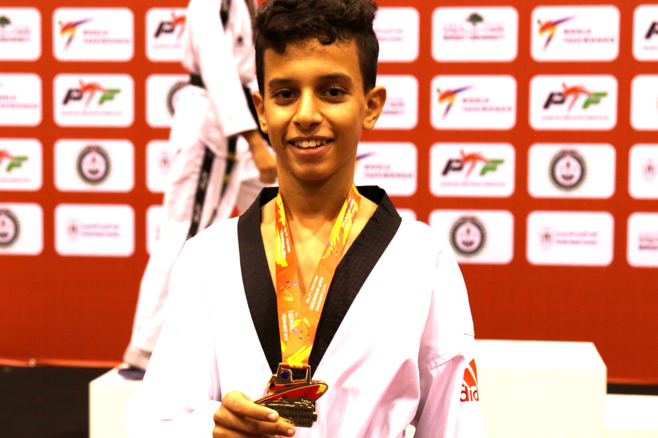 إدارة البطولة استعانت بالمدرب الفلسطيني ابراهيم جودة ليكون مدرباً للطفل خلال النزالات الخاصة به، وأظهر اللاعب مستوىً مميزاً ونجح في تحقيق الانتصار تلو الأخر، وبتفوّق واضح، حتى أنهى مغامرته بفوز مستحق في المباراة الأخيرة على اللاعب راشد الونّه من الأردن، وبنتيجة 17 - 11 نقطة، حسم من خلالها تتويجه بالميدالية الذهبية في وزنه تحت 53 كغم.